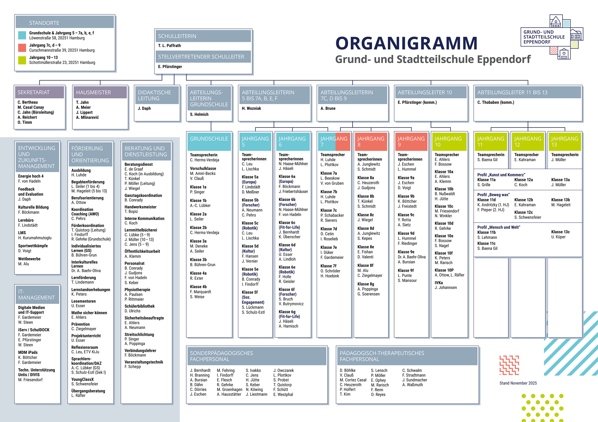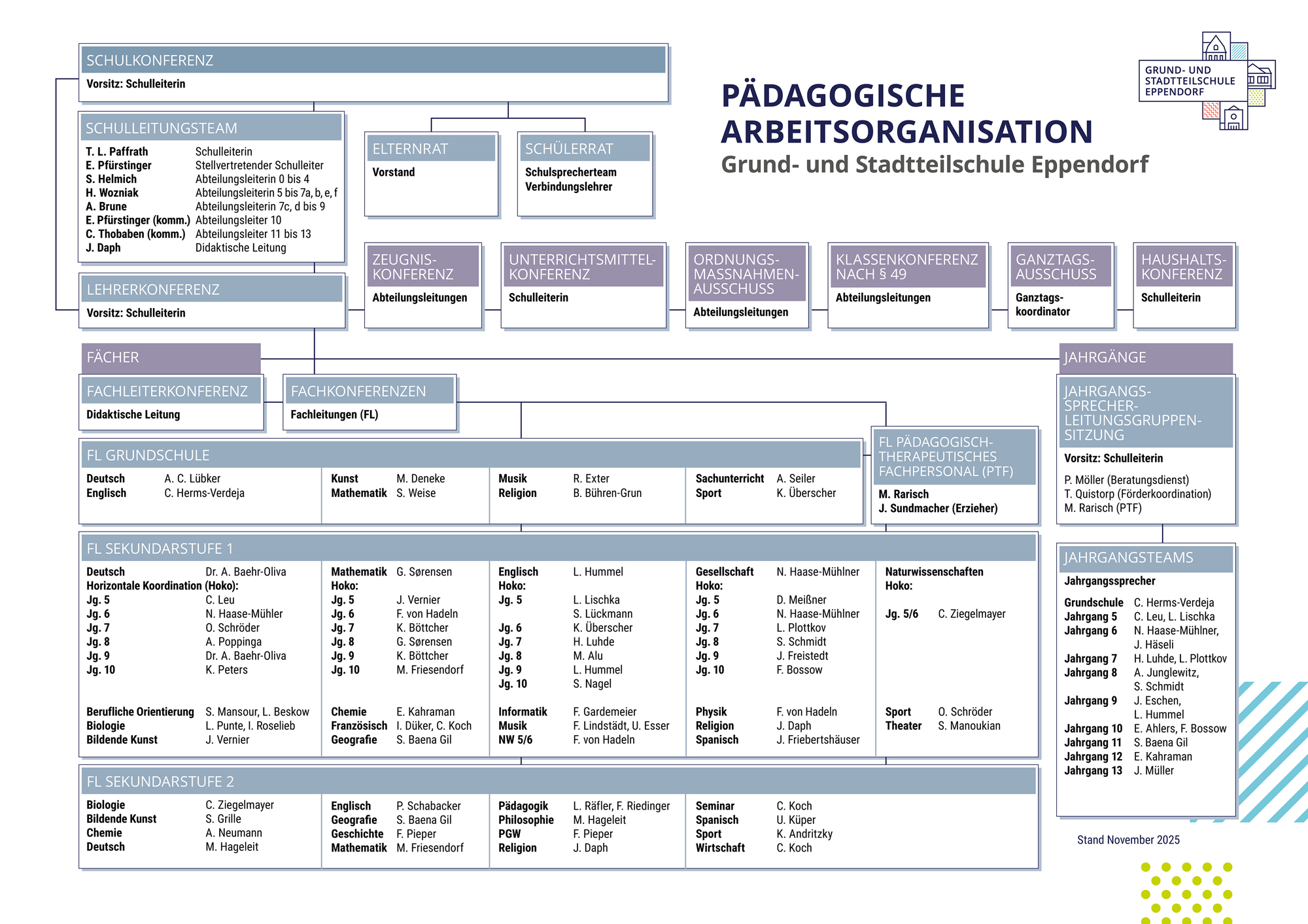 Auch an der Grund- und Stadtteilschule Eppendorf sind viele Hände und Köpfe eingebunden, damit Schule im Ganzen gelingen kann. Wir haben daher an unserer Schule eine Organisationsstruktur entwickelt, die auf einen Blick die einzelnen Bereiche schulischen Handelns und die Verantwortlichen dieser Bereiche ausweist, damit Sie die Verantwortlichen direkt bei Anfragen ansprechen können.